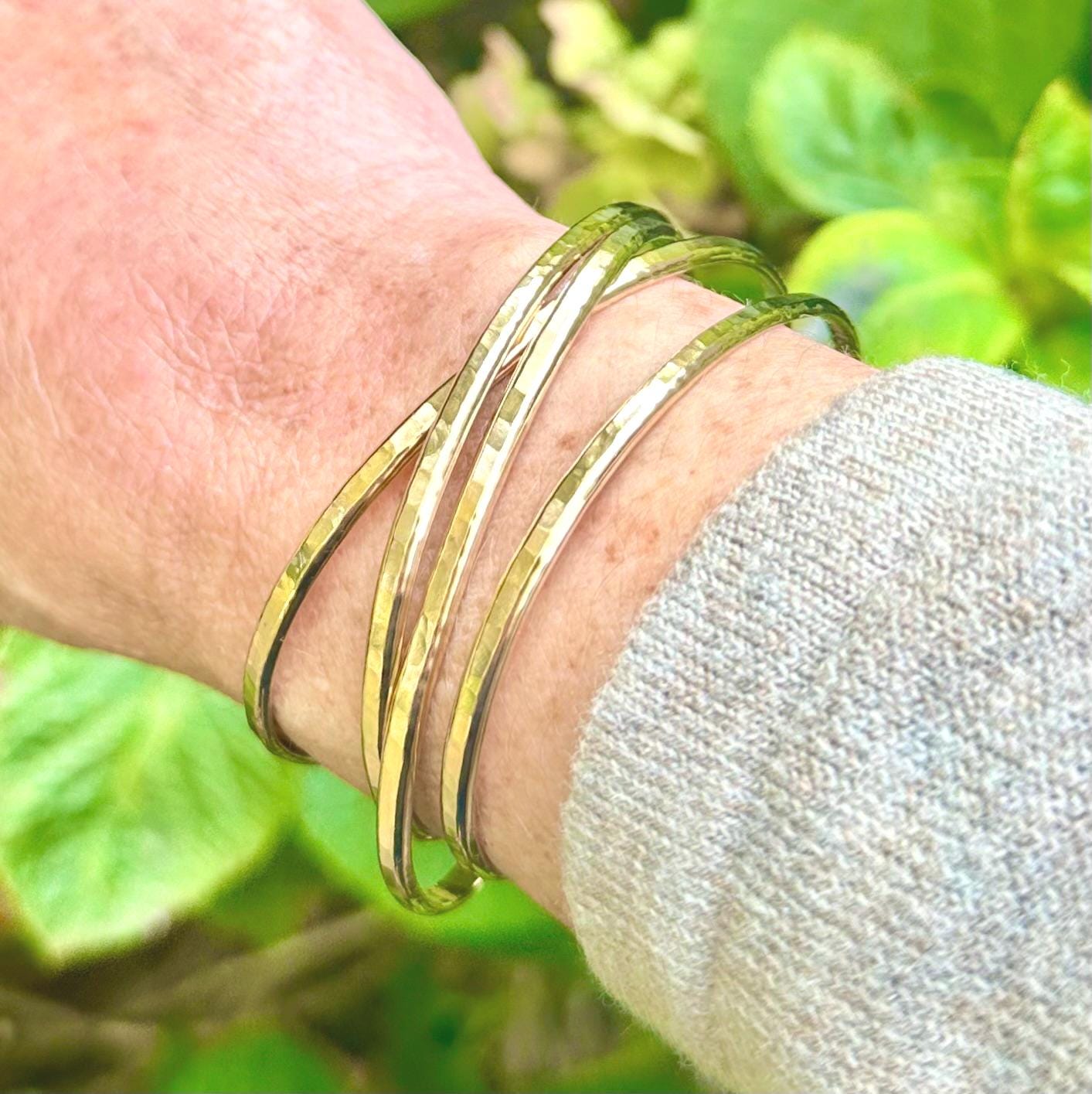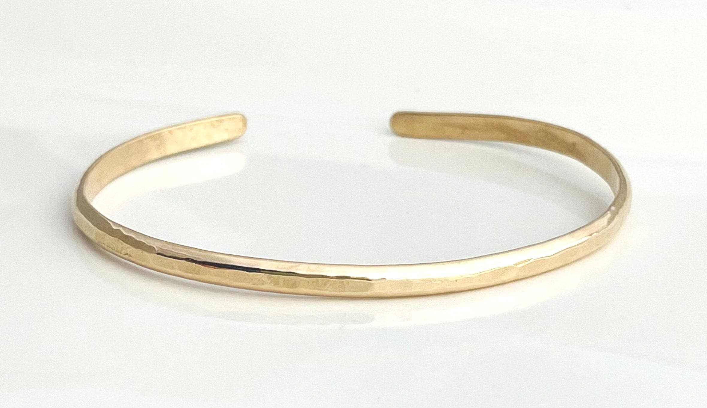 This cuff bracelet is dainty and great for stacking. It has a slightly rounded outside and flat inside against the wrist making it a bit thicker than a standard flat bracelet.