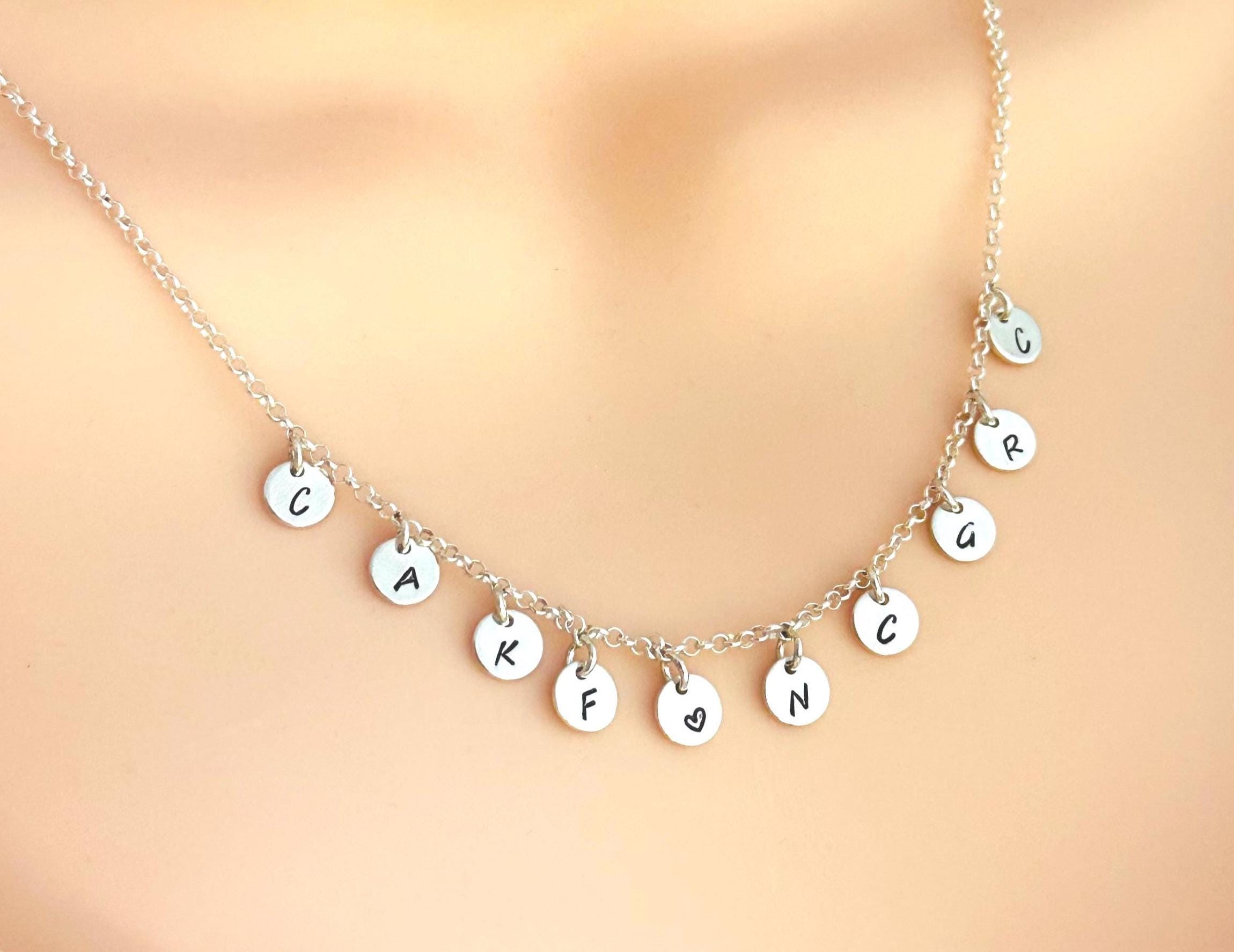 This double, triple or even 12 charm necklace will sparkle and melt mom's heart. Each disc is hand stamped with your choice of initial or symbol representing those who mean the most to you.