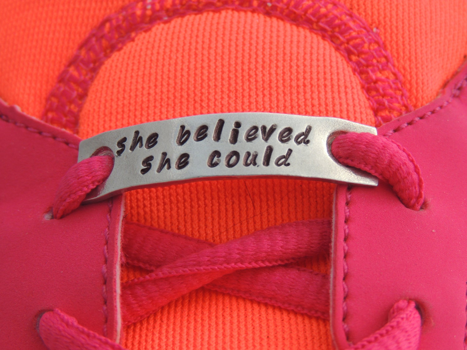 This listing is for a one set of personalized running shoe charms. These charms measure a little over 1-1/2" in length and are made of thick pewter. The pewter is very sturdy, yet you also are able to bend it to fit nicely on your shoe.