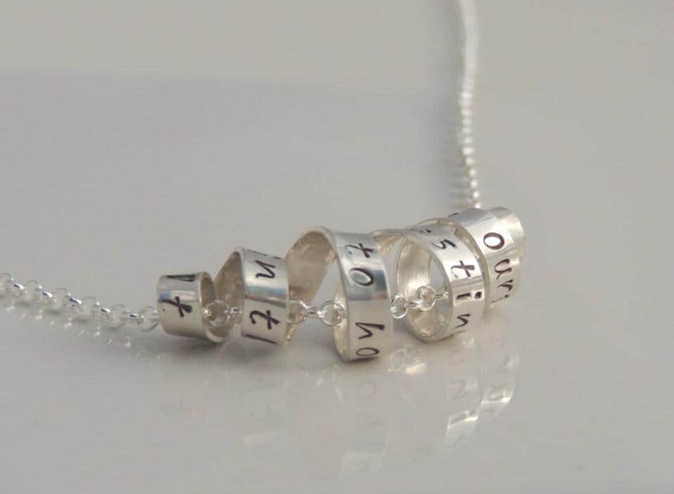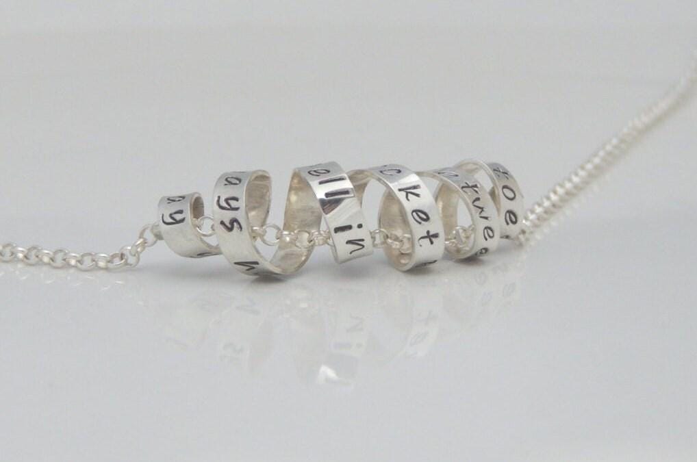 This necklace features a beautiful hand spiraled pendant that is hand stamped with your choice of saying. Choose any saying, names or text up to 65 characters. The pendant is made of solid sterling silver and measures 1/8" in width.