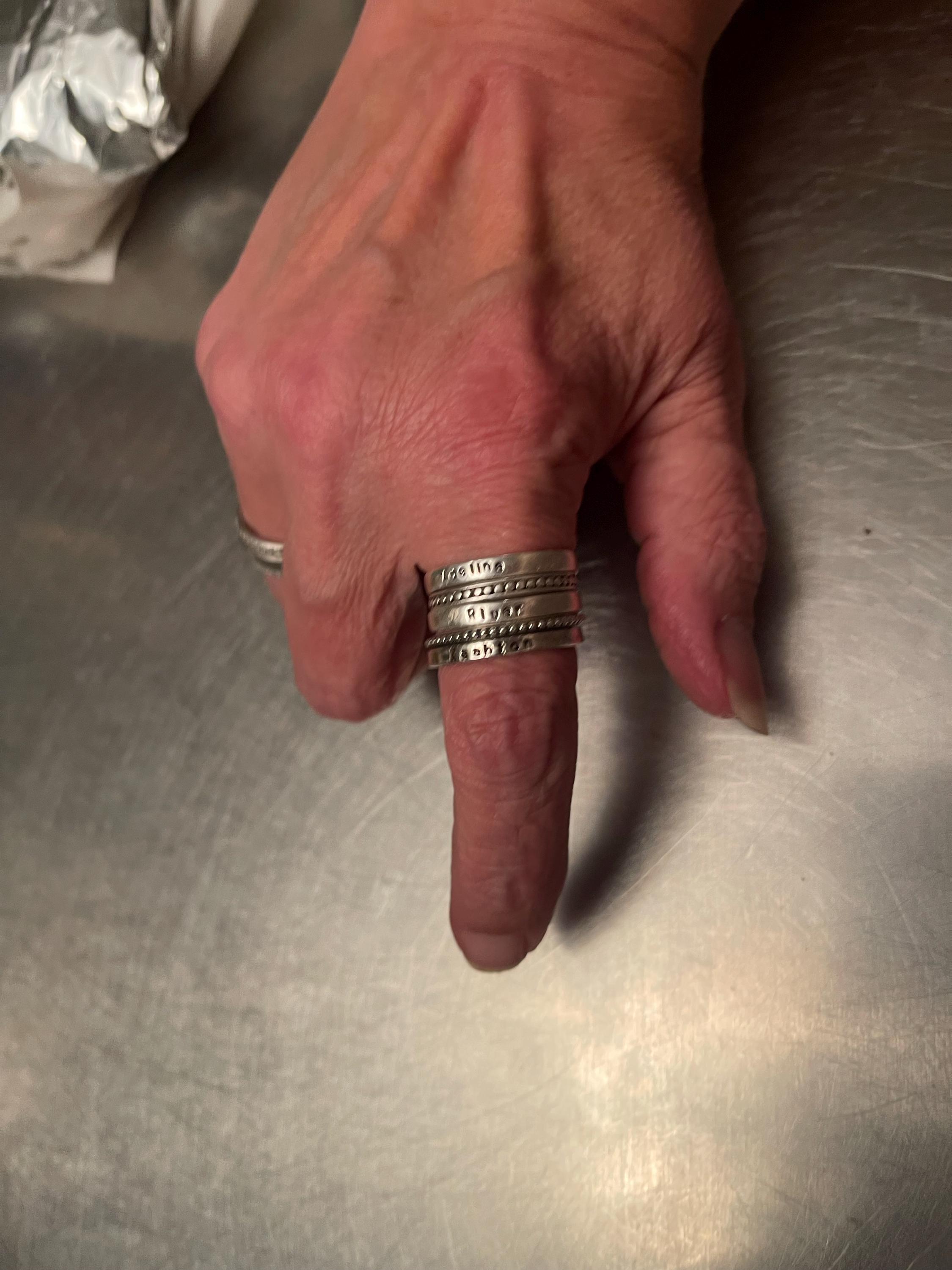 Each ring is made of solid .925 sterling silver. Name rings are hand hammered for an organic, rustic look. Each name ring can be hand stamped with your choice of name, text or date.