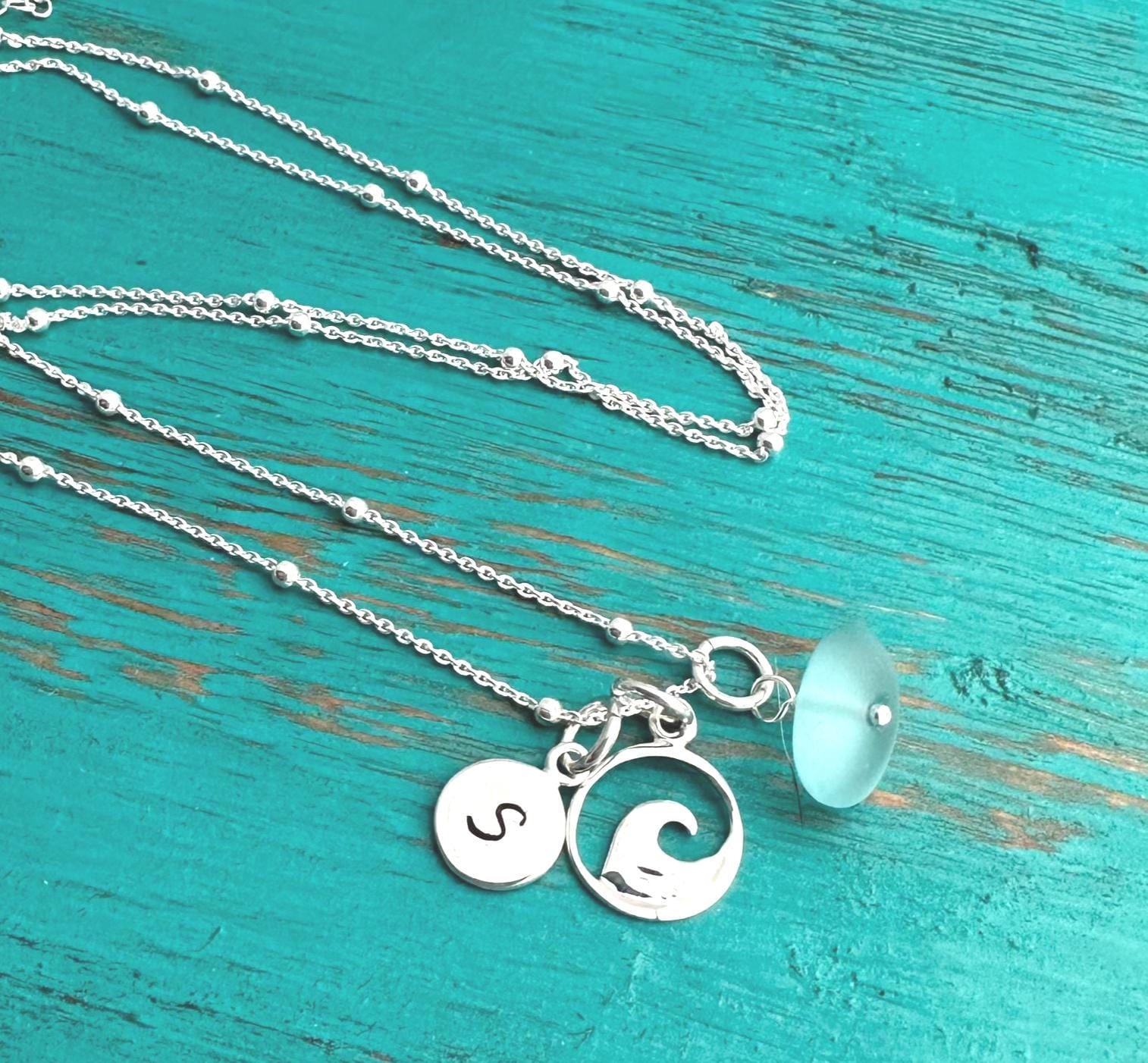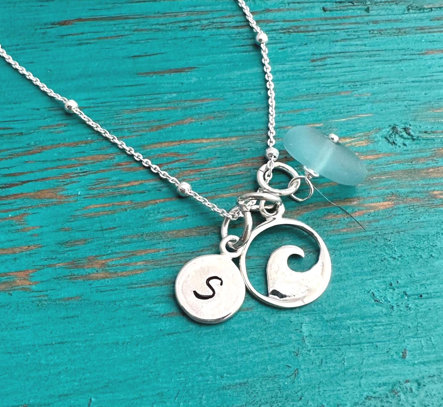 This beautiful necklace features a custom, sterling hand stamped initial disc, sterling wave charm and your choice of sterling silver wrapped sea glass charm.