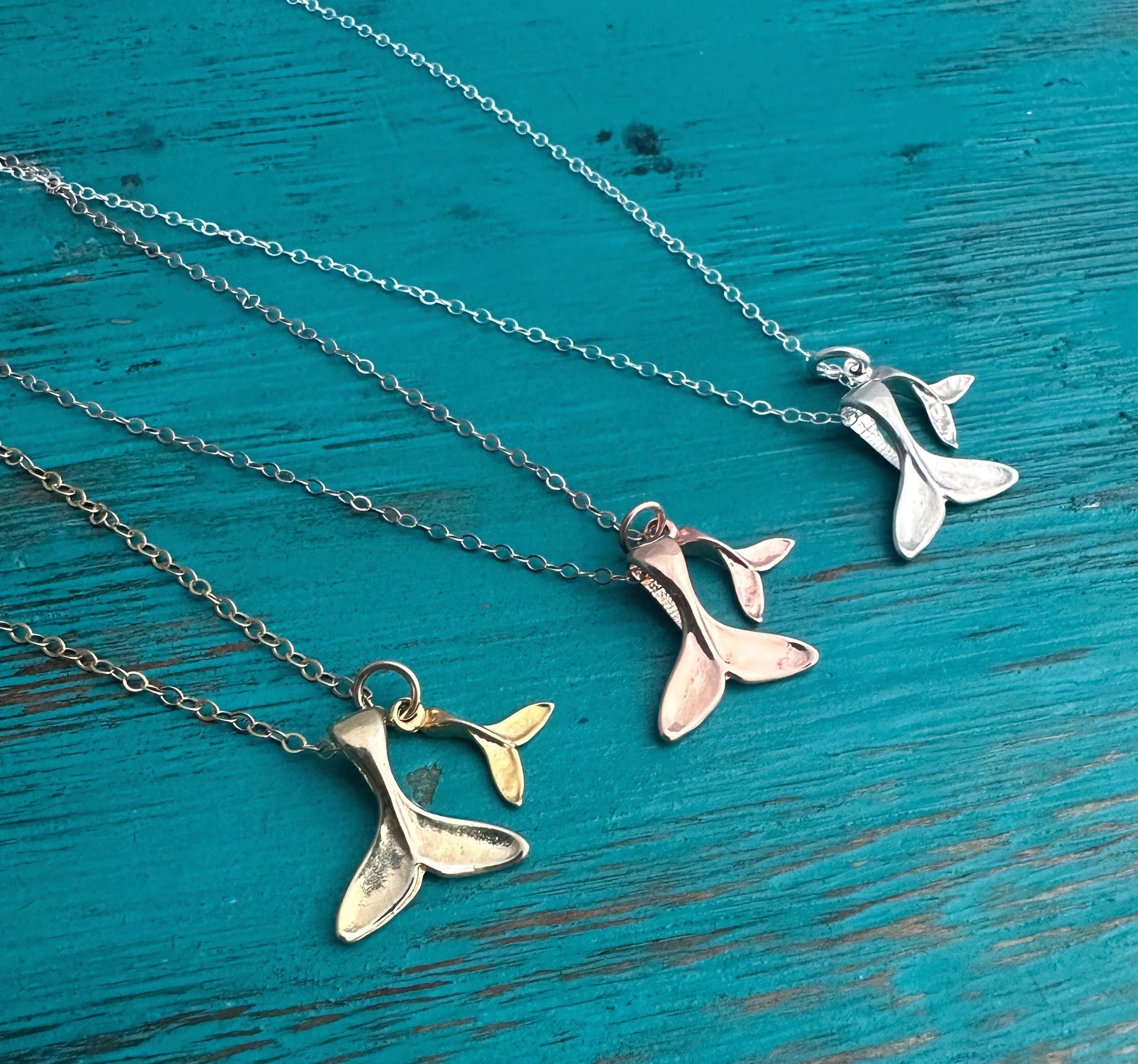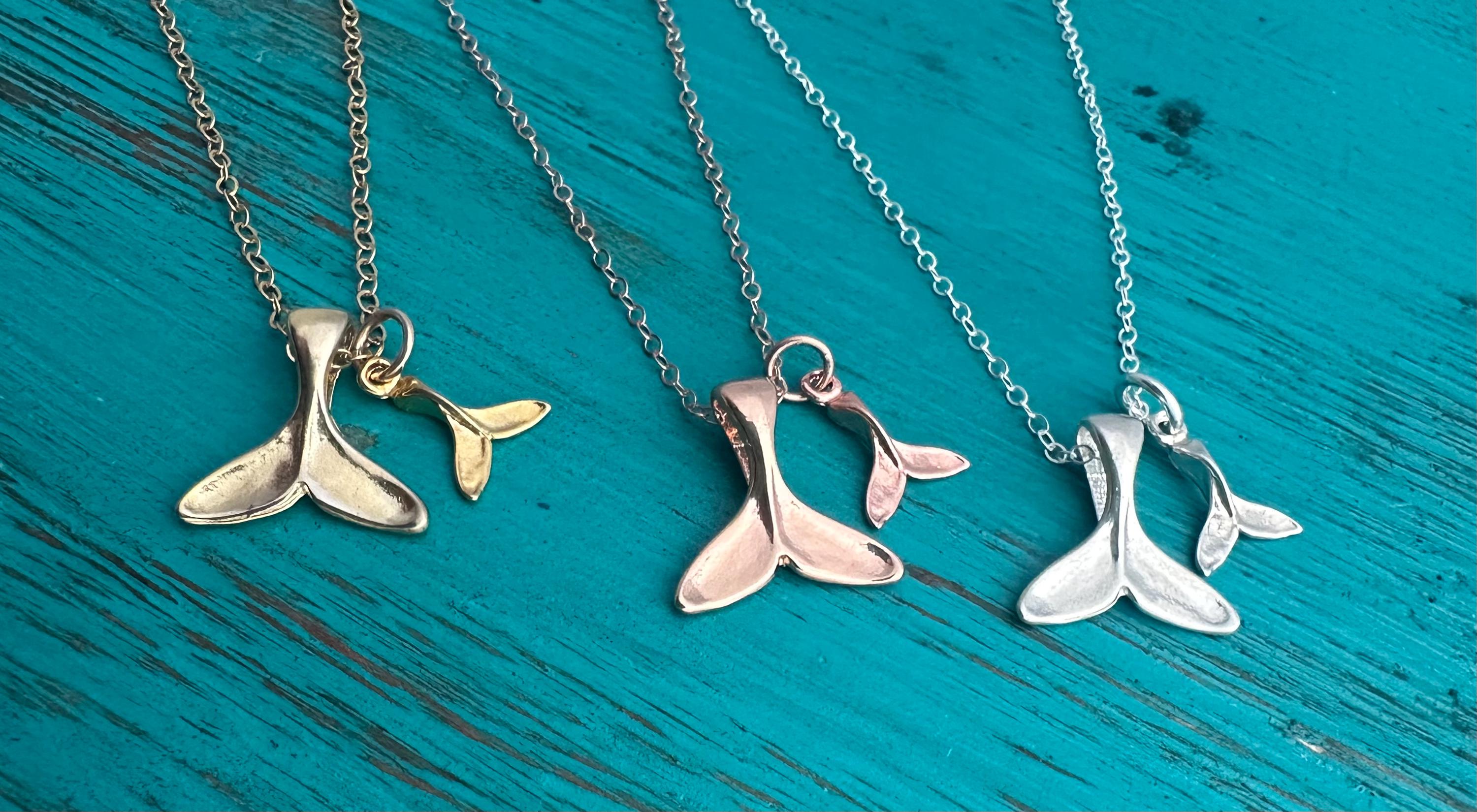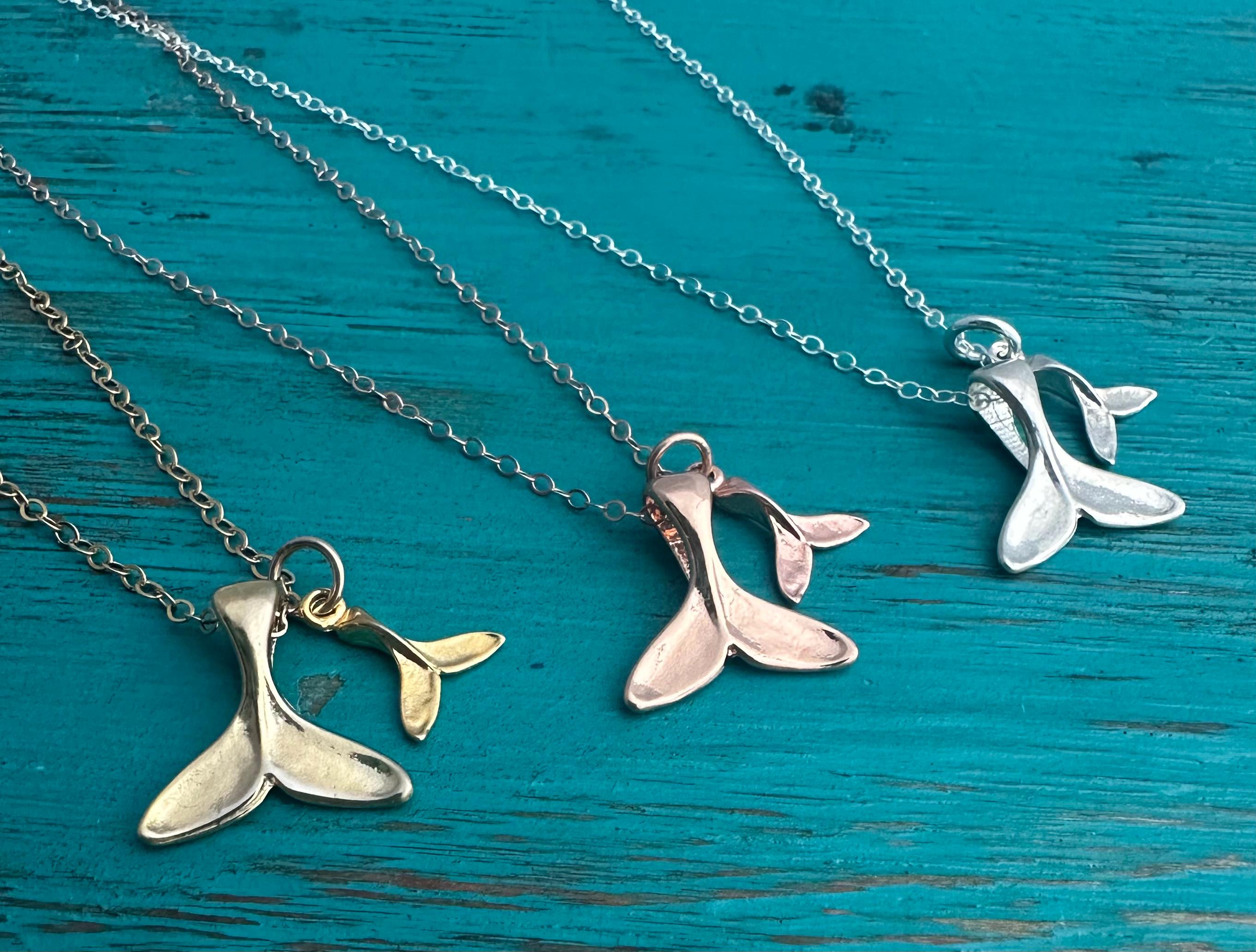 Necklace includes one large whale tail slide, one small whale tail pendant and chain with 1" extension.