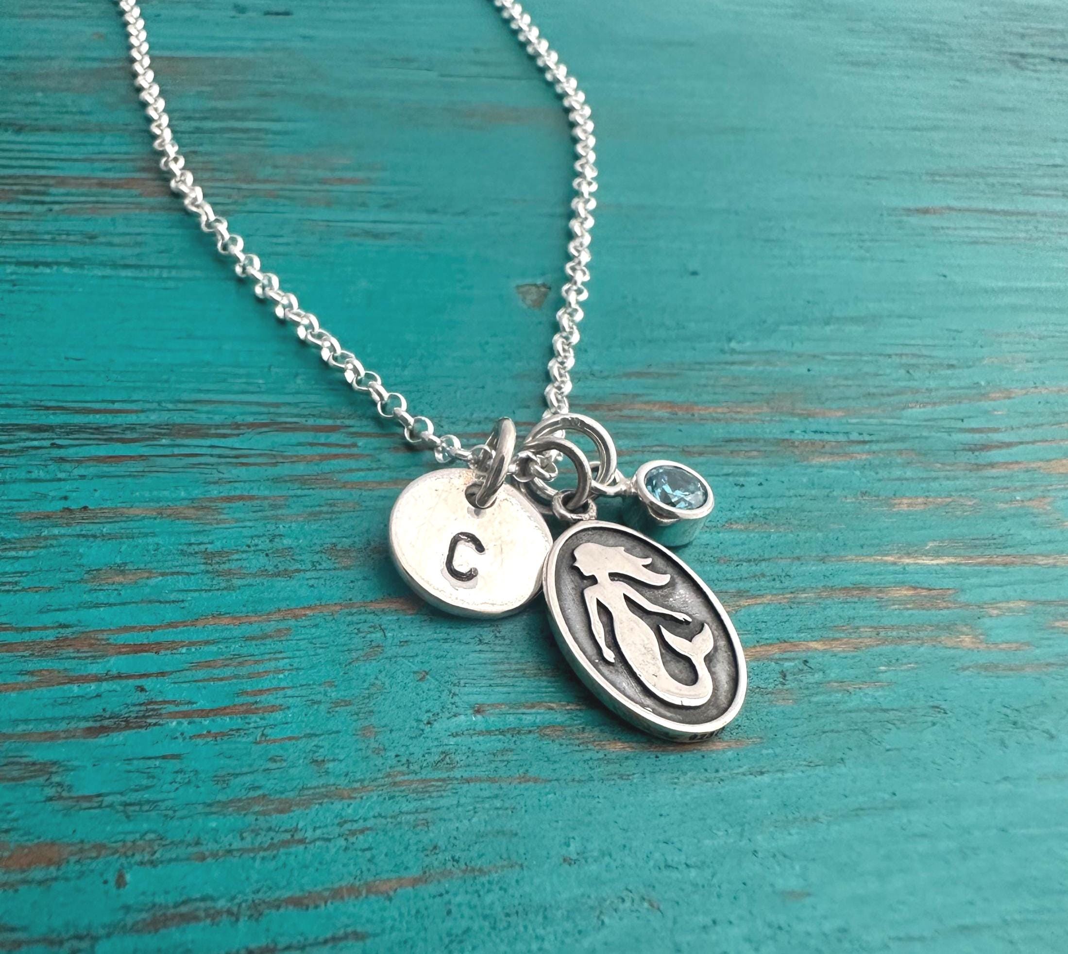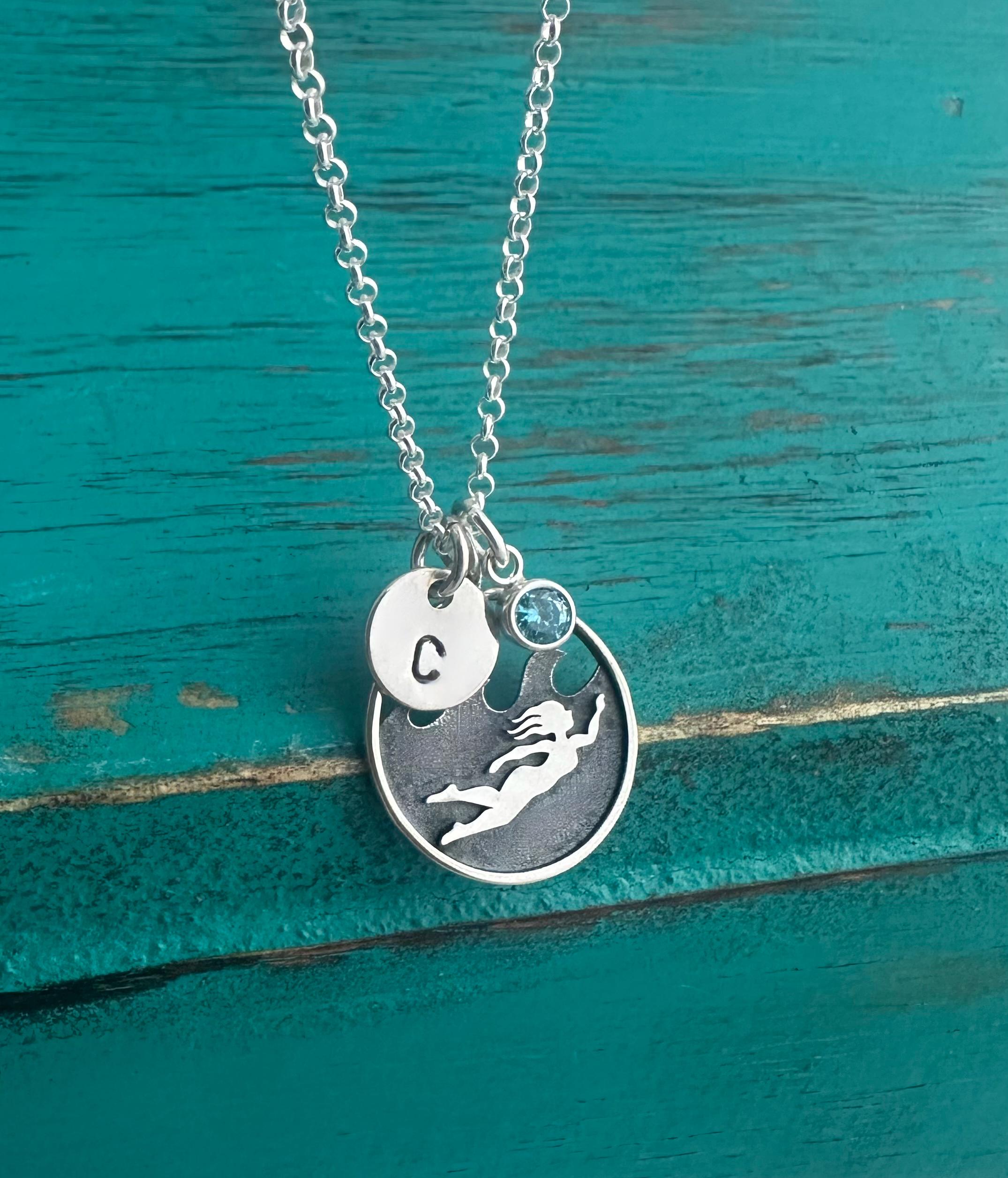 This sterling silver swim necklace features a sterling silver initial disc, sterling swim charm (choose from 3 options) and a sterling silver wrapped birthstone in your choice of color.