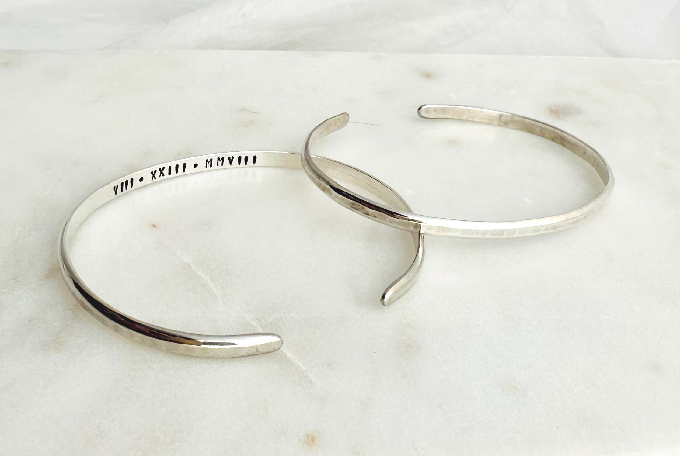 All cuff bracelets are completely hand made by hand cutting the silver, hand hammering, hand stamping and polishing the finished cuff.