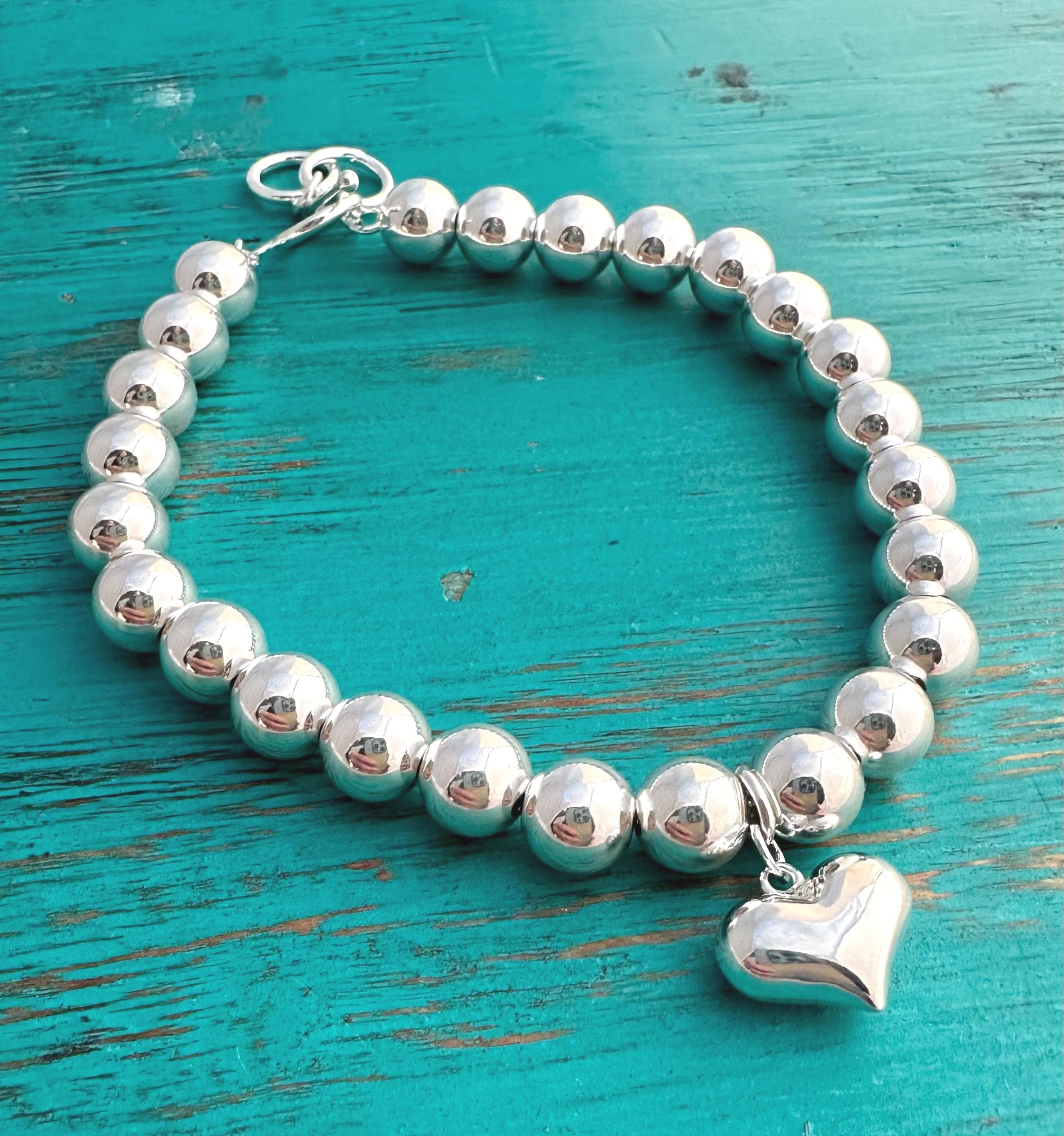 This bracelet features sterling silver smooth beads strung on a durable sterling silver chain and finished with a puffy, sterling silver heart.