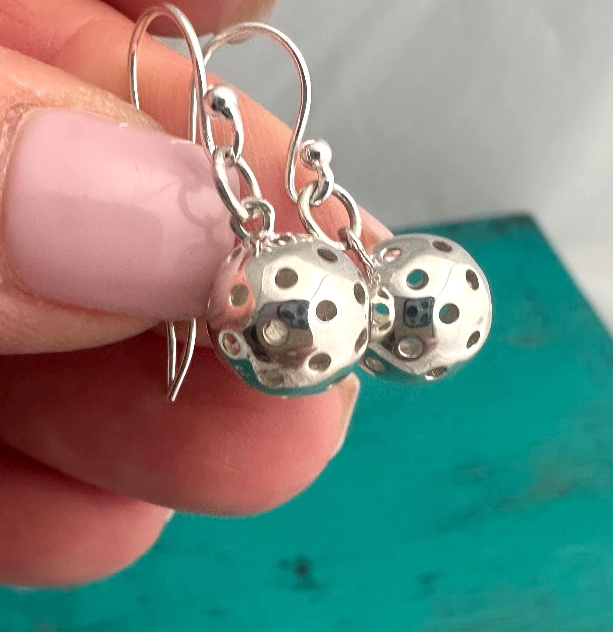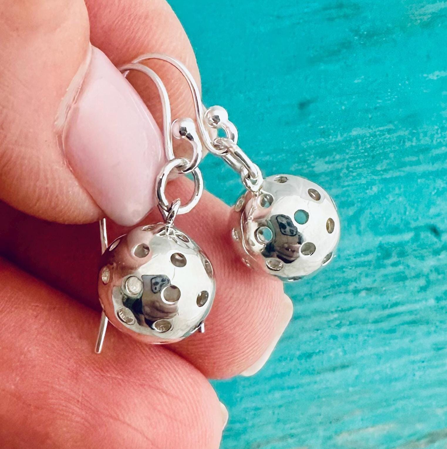 Beautiful, sterling silver hand made pickleball earrings. These earrings are made to order by me in my studio. They feature a dangling pickleball charm that moves when you do.