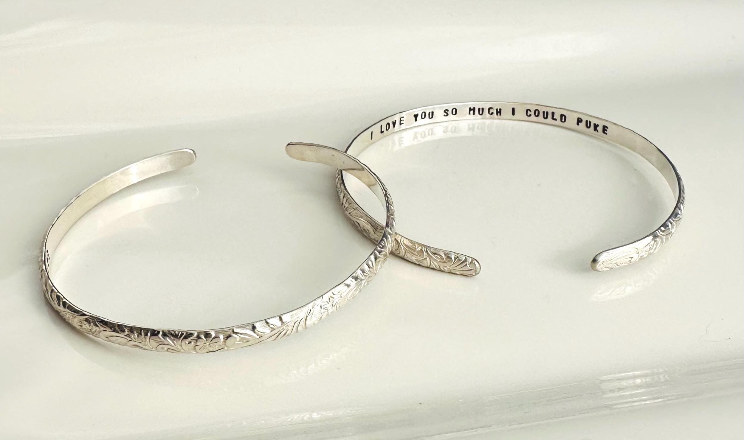 These beautiful cuff bracelets are handmade in the USA with care and attention to detail. Each bracelet is individually crafted by hand-cutting the wire, hand-stamping your special inscription, and polishing to perfection.