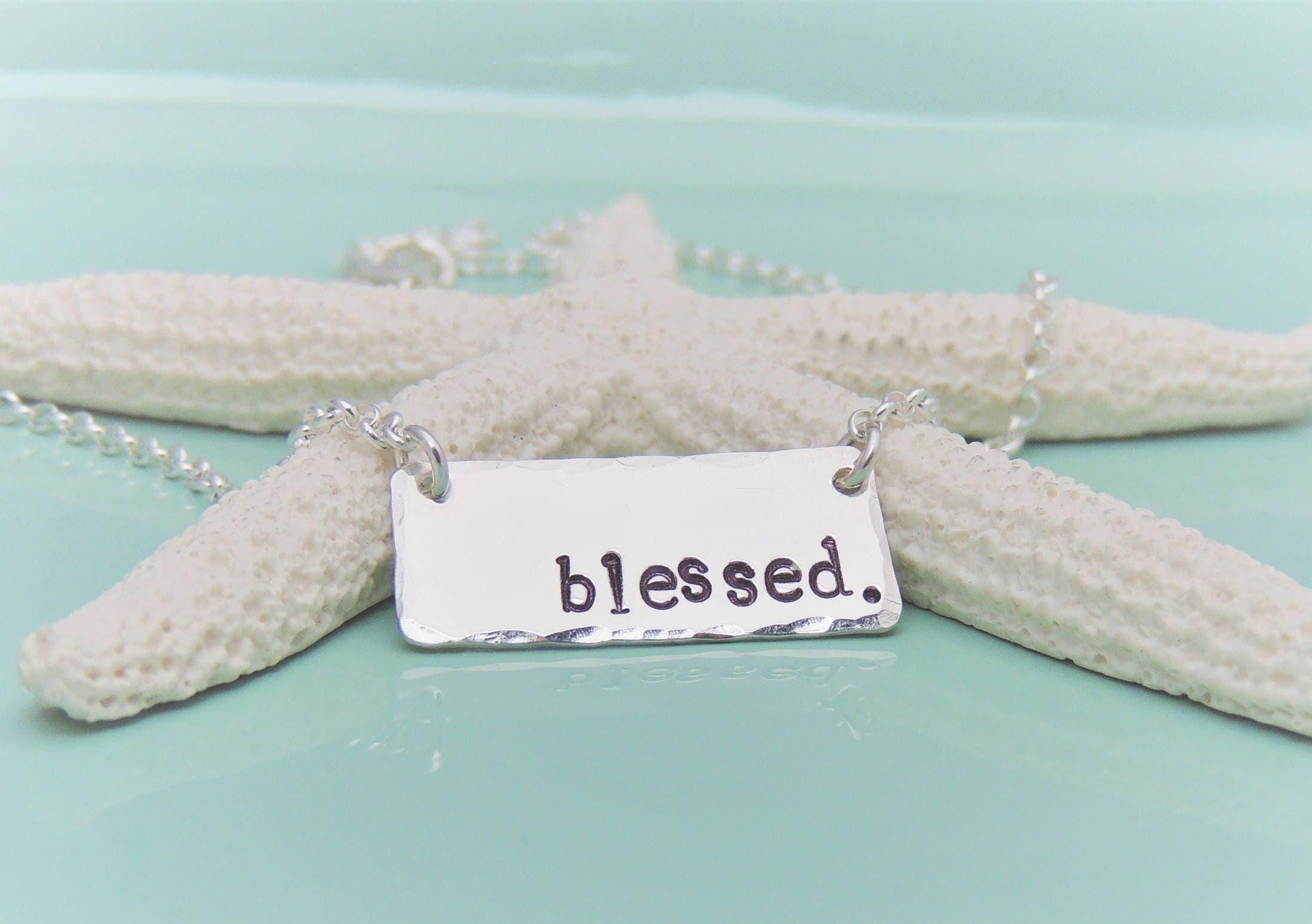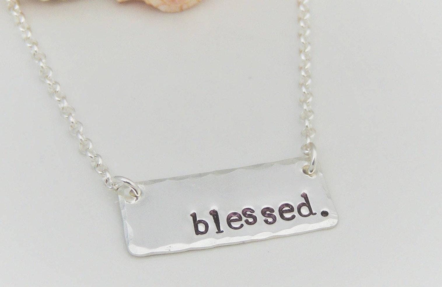 This bar necklace is hand stamped with "blessed." or your choice of inspirational word or name.