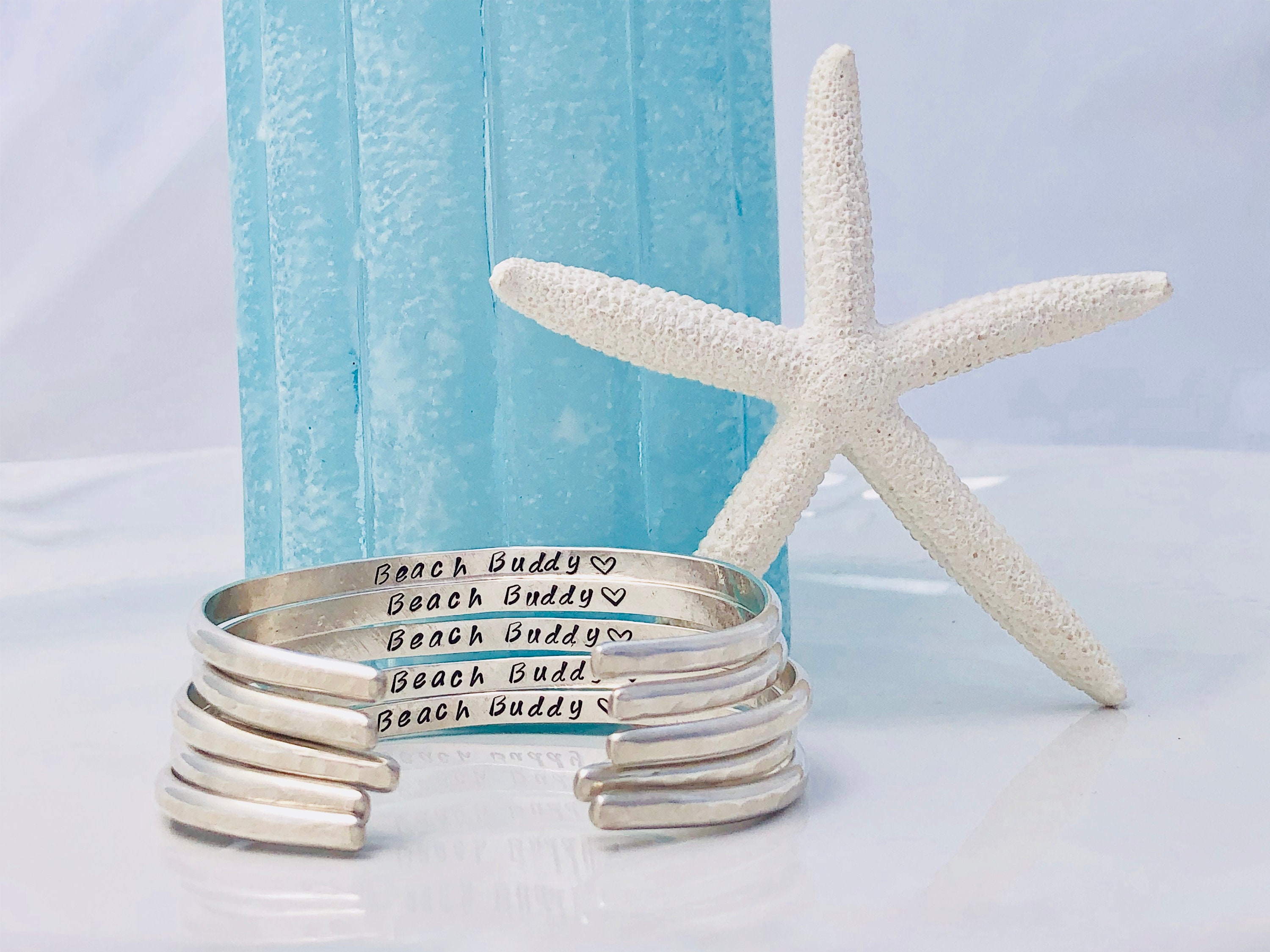 These bracelets are completely hand made by hand cutting the silver, hand hammering, hand stamping and polishing the finished cuff. Have your bracelet stamped with a personal saying, inspirational quote, names and/or dates. This bracelet can be hand stamped on the outside, inside or both sides of the cuff.