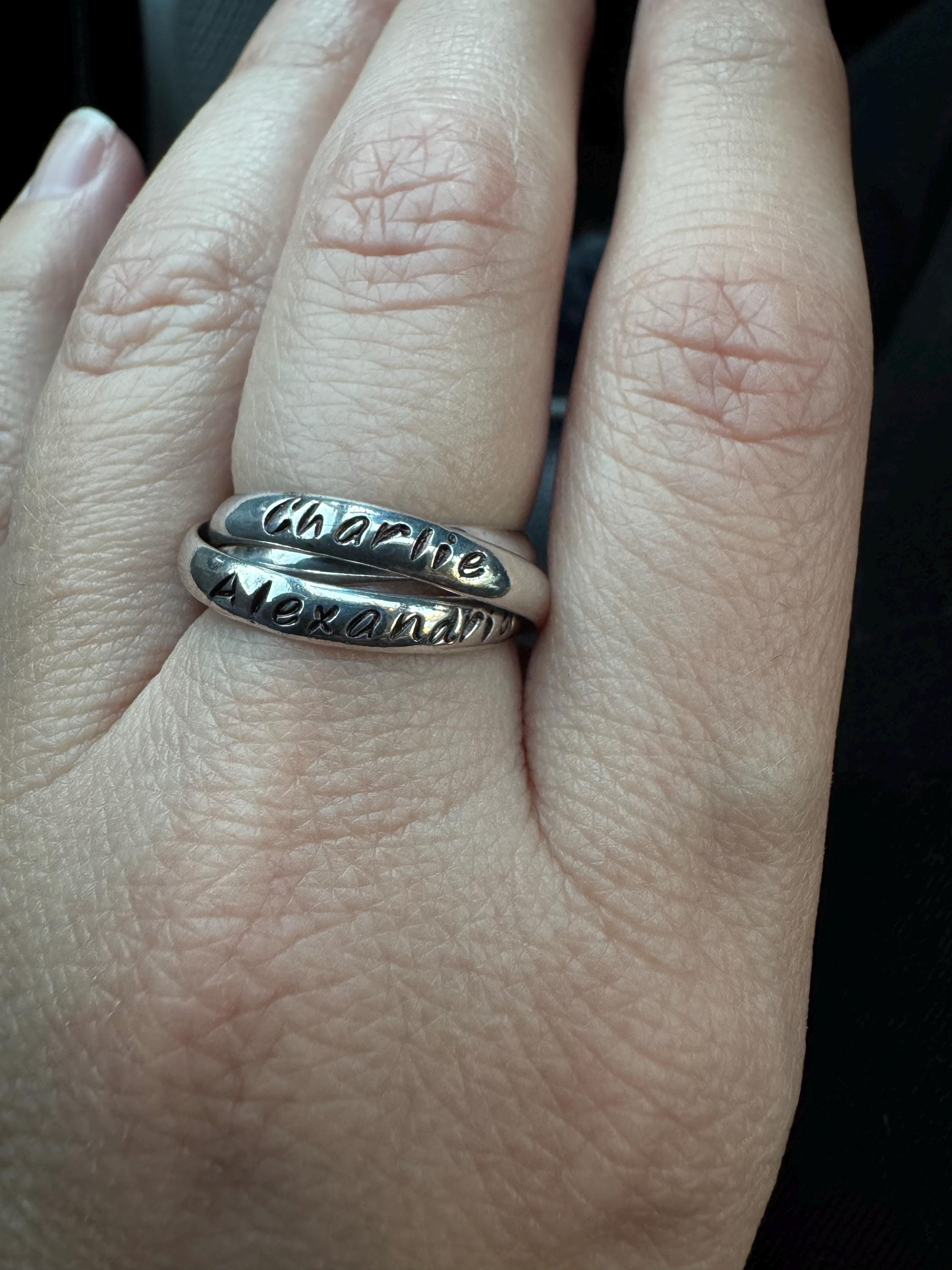 Each band on the ring can be hand stamped with your choice of name or text (up to 14 characters on each band).