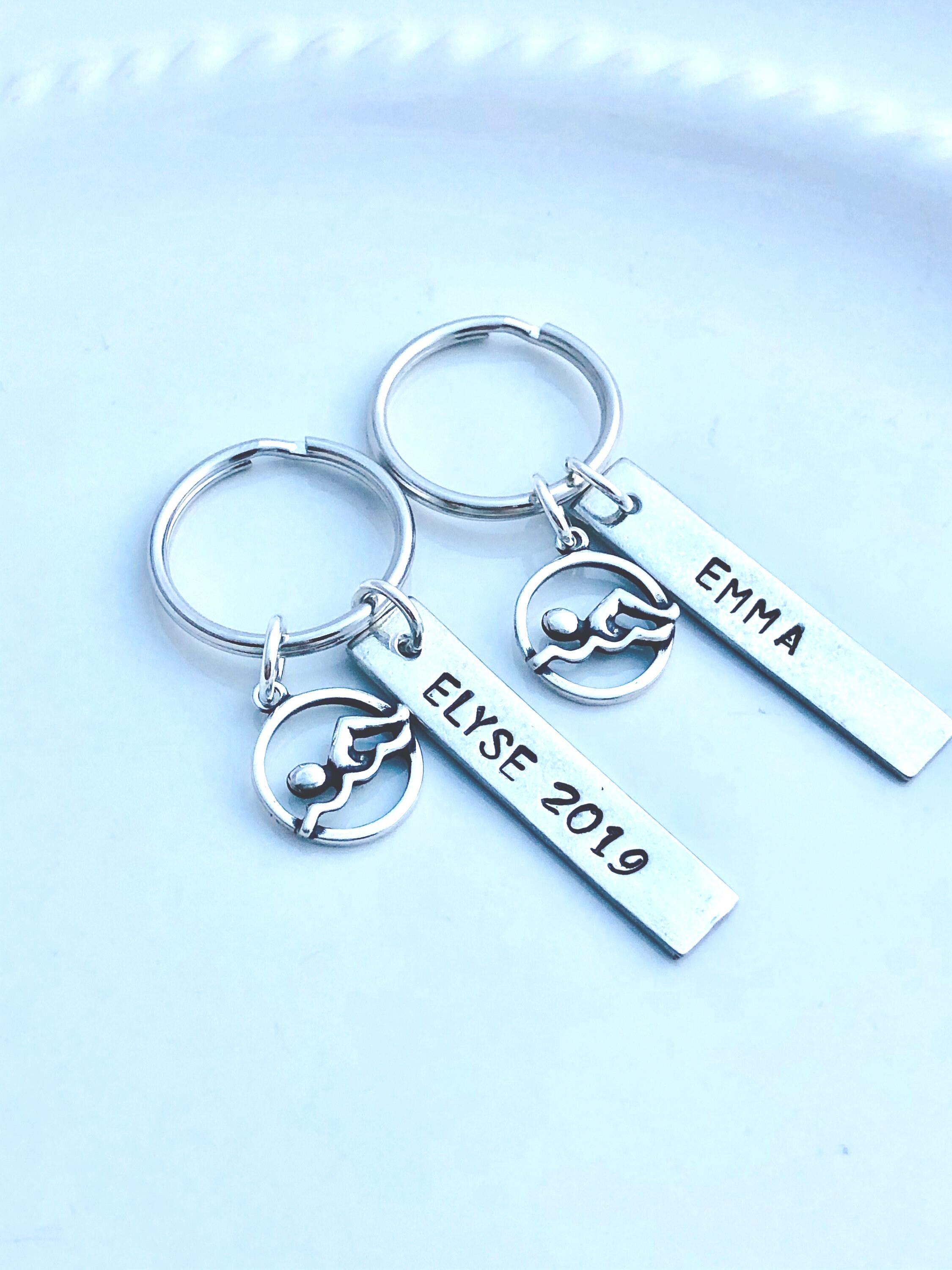 Includes hand stamped bar charm, key chain and your choice of swimmer charm.